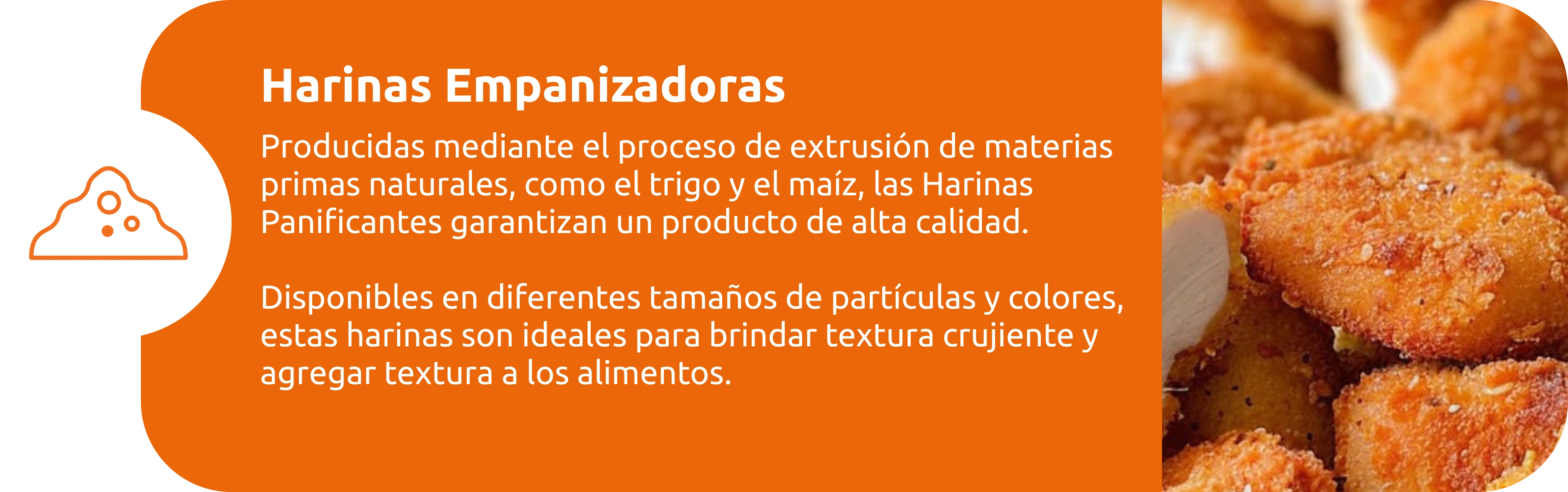 Producidas mediante el proceso de extrusión de materias primas naturales, como trigo y maíz, las Harinas para Empanizado garantizan un producto de alta calidad. Disponibles en diferentes granulometrías y colores, estas harinas son ideales para aportar crocancia y agregar textura a los alimentos.